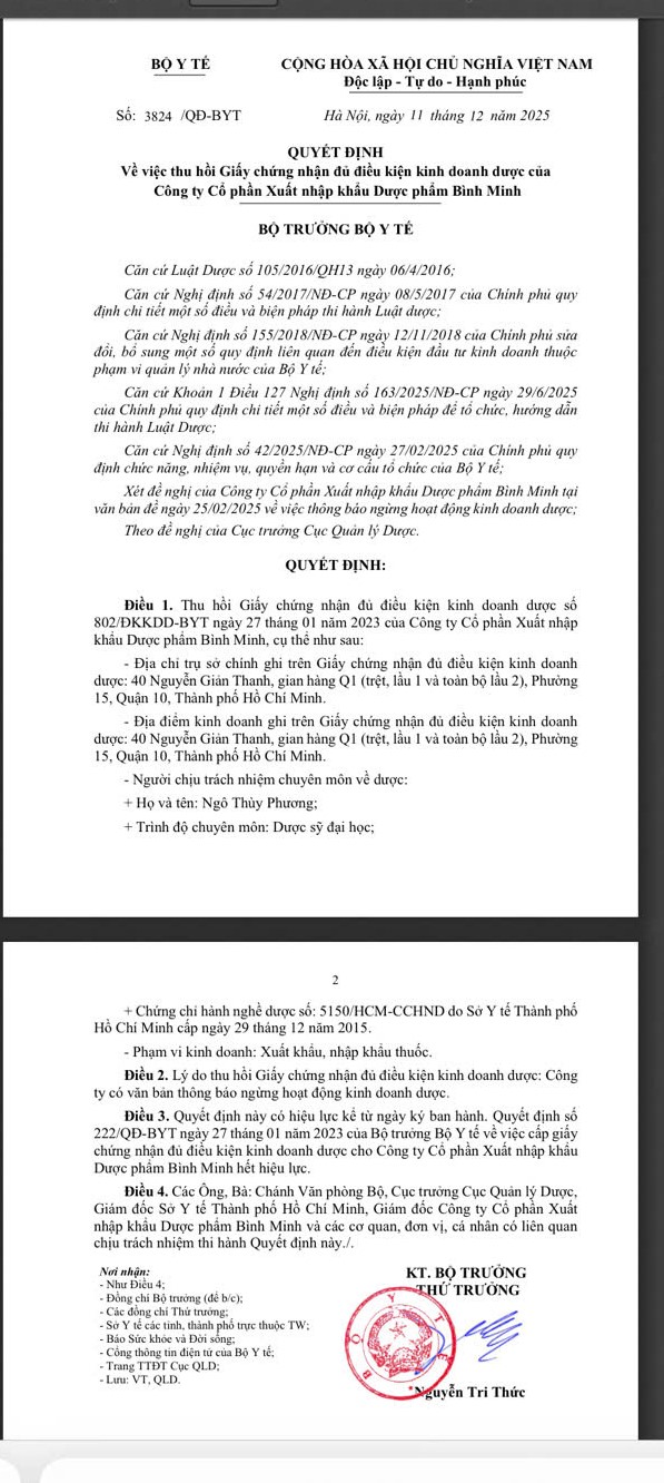 Thứ Năm, ngày 11/12/2025 15:16PGS.TS Nguyễn Tri Thức, Thứ trưởng Bộ Y tế vừa ký ban hành Quyết định số 3824 /QĐ-BYT, ngày 11 tháng 12 năm 2025 về việc thu hồi Giấy chứng nhận đủ điều kiện kinh doanh dược số 802/ĐKKDD-BYT ngày...