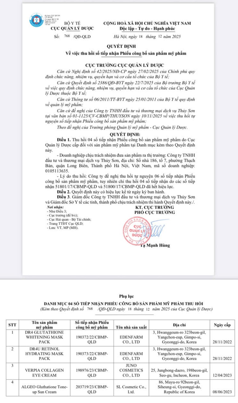 Bộ Y tế thu hồi 4 số tiếp nhận Phiếu công bố sản phẩm mỹ phẩm