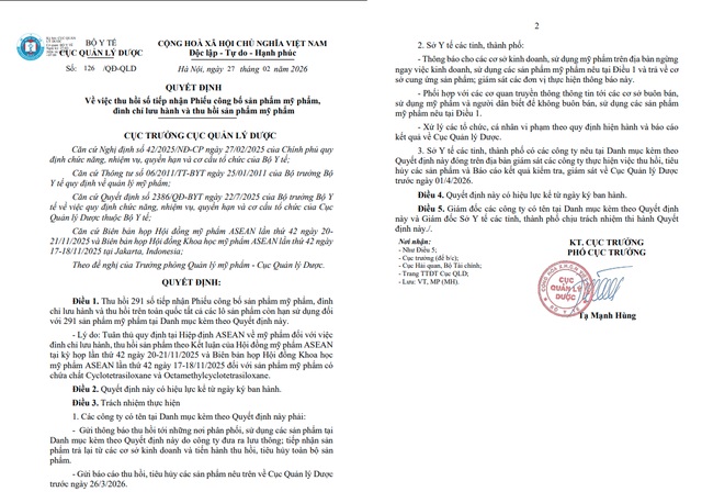 Thứ Ba, ngày 03/03/2026 01:04Cục Quản lý Dược, Bộ Y tế vừa ra Quyết định thu hồi phiếu tiếp nhận công bố mỹ phẩm, đình chỉ lưu hành và thu hồi sản phẩm đối với 291 mỹ phẩm có chứa chứa Cyclotetrasiloxane và...