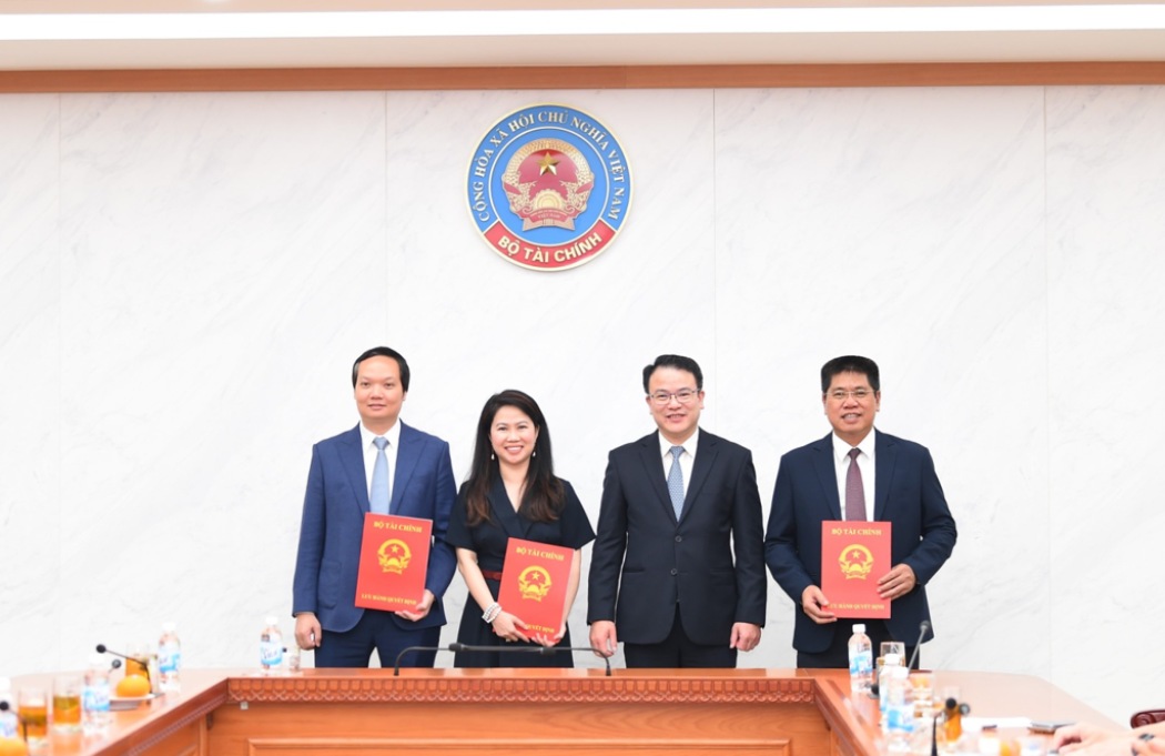 Thứ trưởng Trần Quốc Phương trao quyết định cho các tân lãnh đạo của 3 đơn vị. Ảnh: Bộ Tài chính