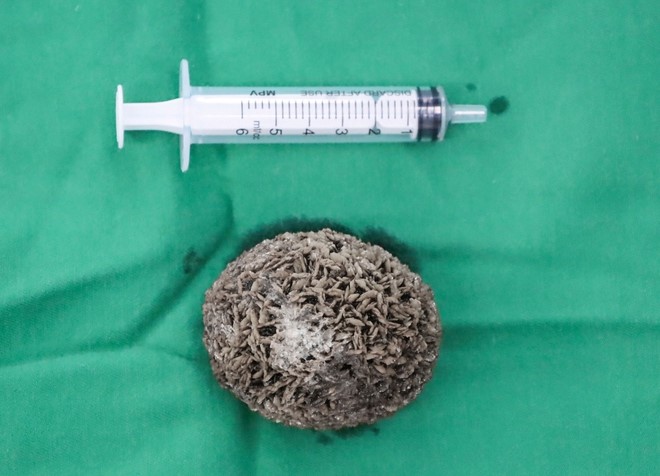 Viên sỏi bàng quang kích thước khoảng 60x40 mm được lấy ra sau phẫu thuật tại Bệnh viện Ngoại khoa 115 Nghệ An.