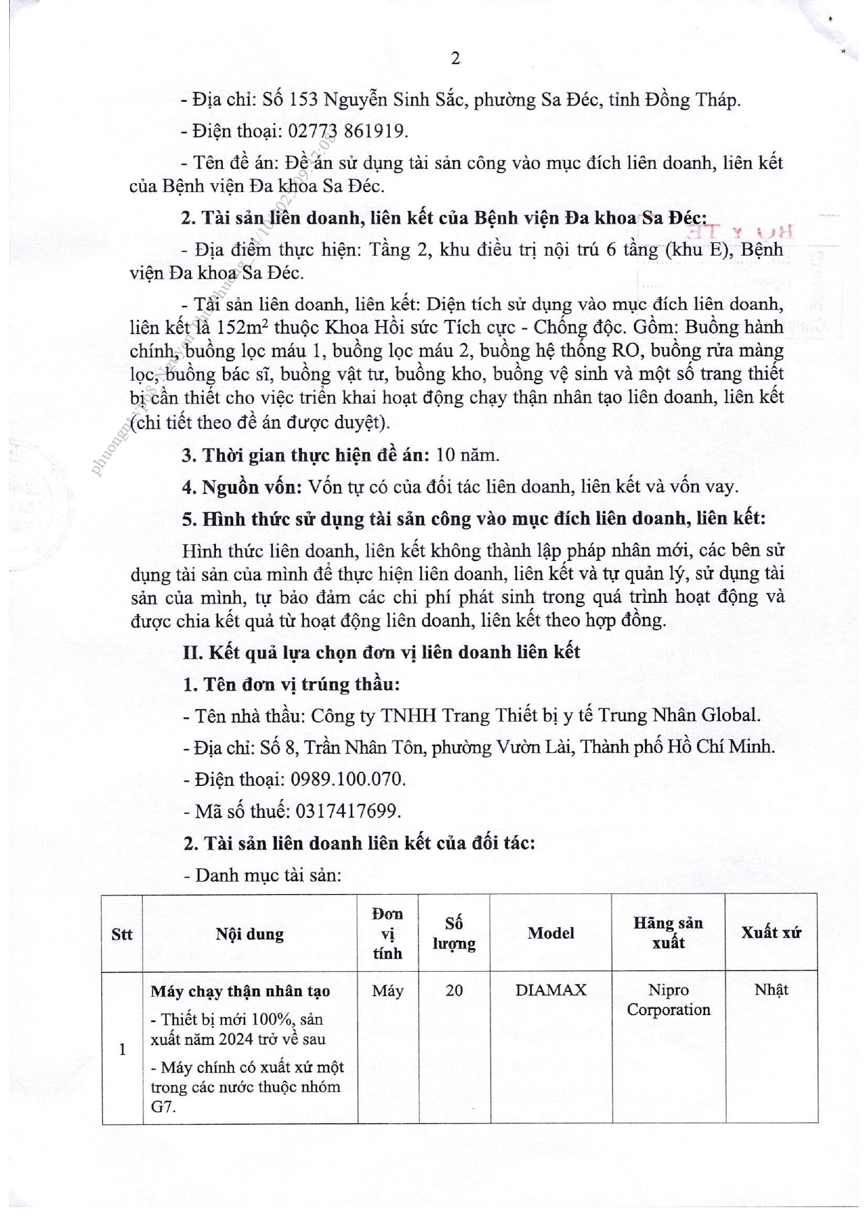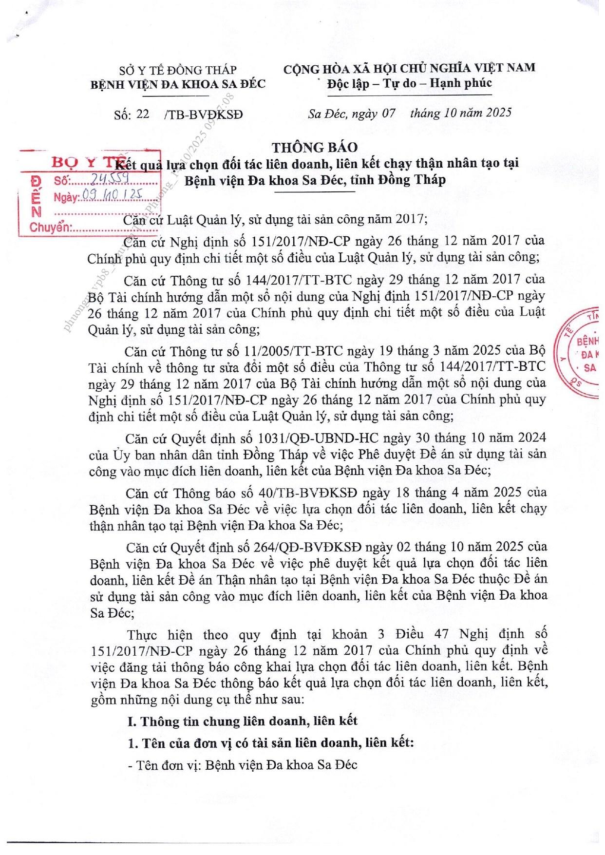 Thông báo kết quả lựa chọn đối tác liên doanh, liên kết chạy thận nhân tạo tại Bệnh viện Đa khoa Sa Đéc, tỉnh Đồng Tháp