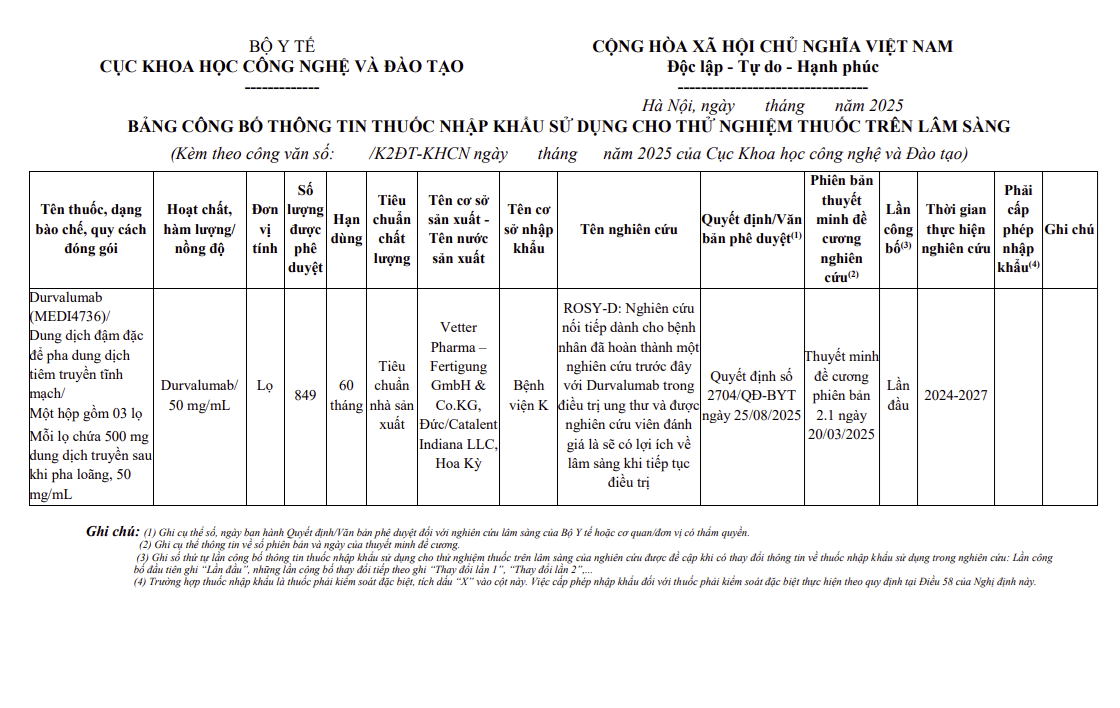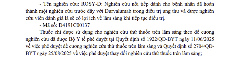 Thông tin các thuốc nhập khẩu sử dụng cho thử nghiệm thuốc trên lâm sàng (Mã số: D4191C00137)