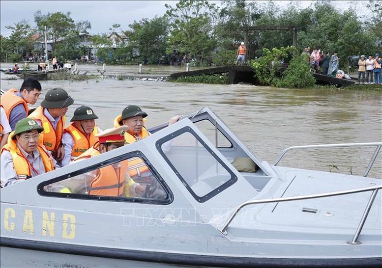Tổng Bí thư Tô Lâm đến khu vực bị chia cắt do mưa lũ tại thôn Khuông Phò Đông, xã Quảng Điền, Thành phố Huế - Ảnh: TTXVN