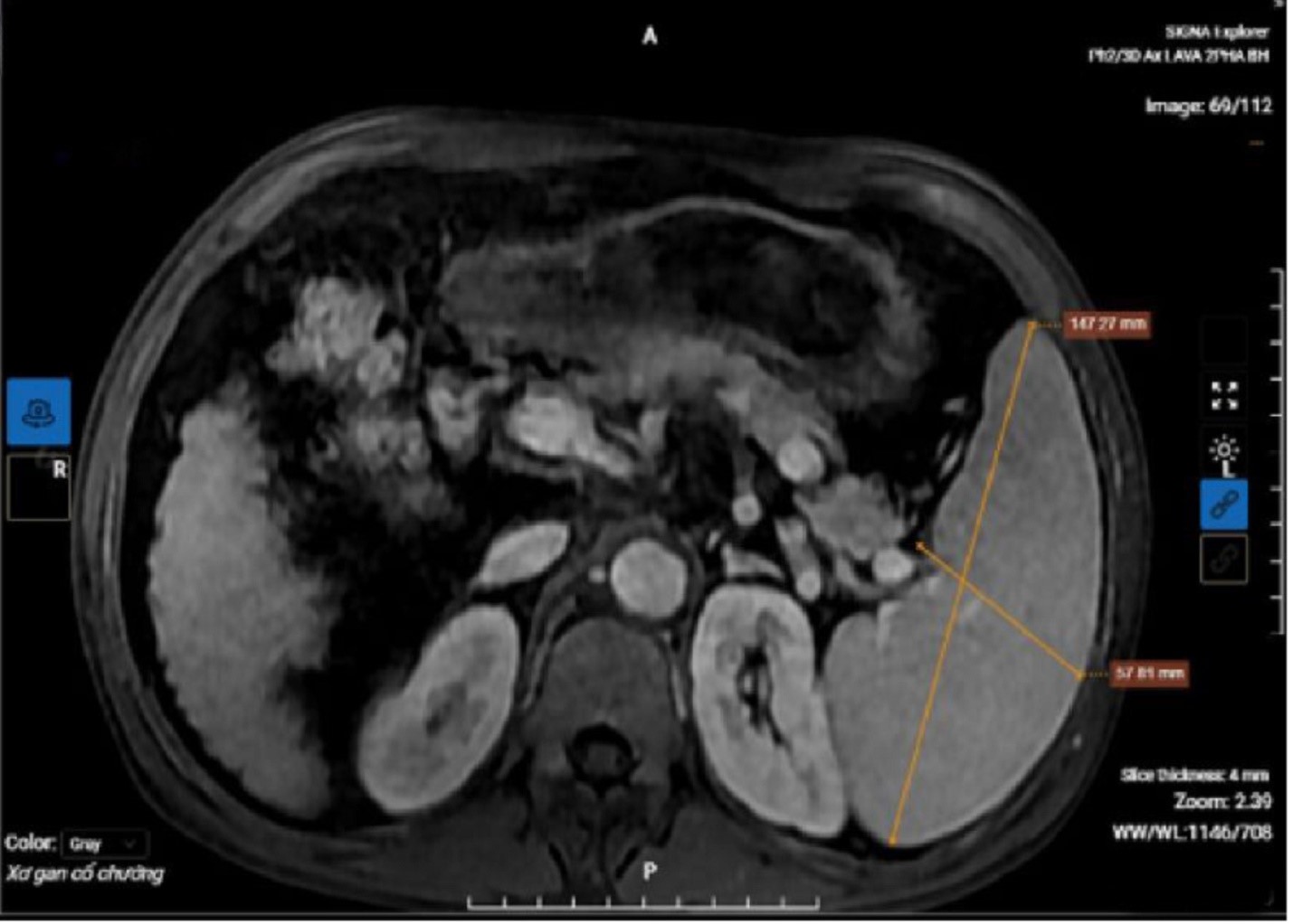 Kết quả chụp MRI của bệnh nhân cho thấy hình ảnh xơ gan lách to, dịch bao quanh gan.