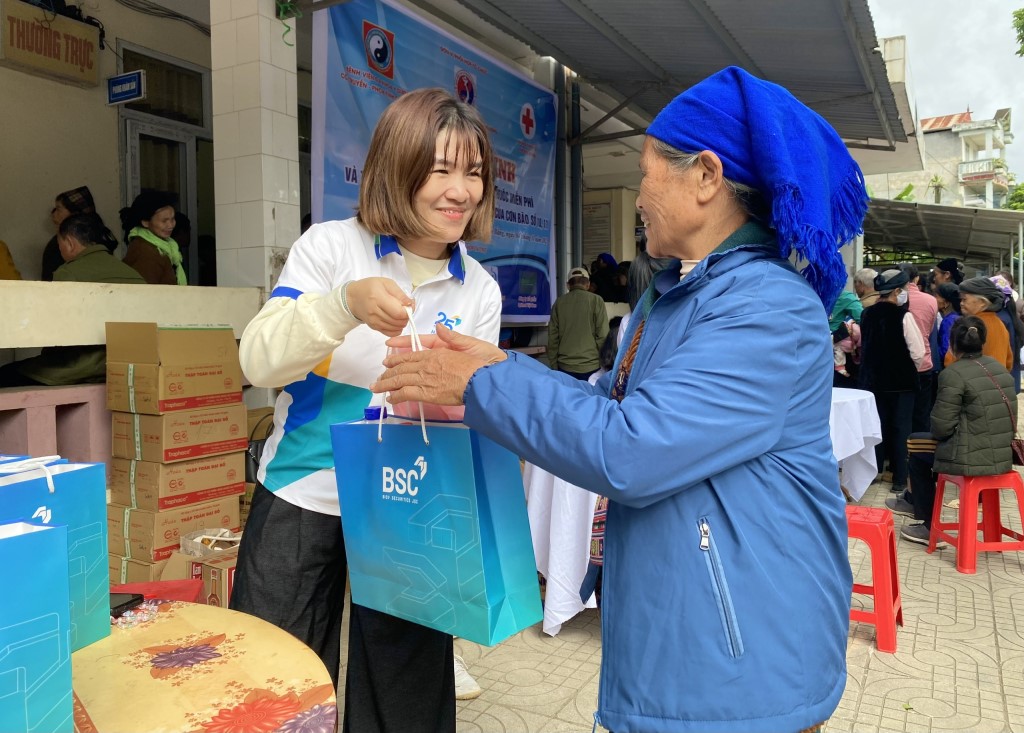 Các đơn vị đồng hành cùng bệnh viện trao tặng quà cho người dân vùng bị ảnh hưởng bởi bão lũ.