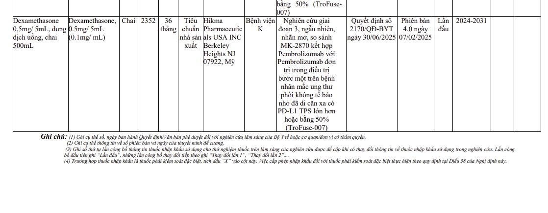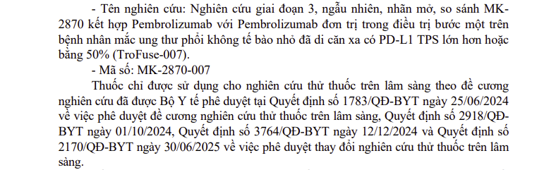 Thông tin thuốc nhập khẩu sử dụng cho thử nghiệm thuốc trên lâm sàng, mã số: MK-2870-007