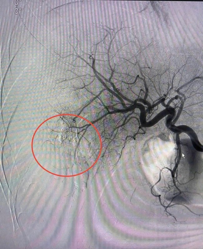 Bác sĩ Nguyễn Đức Hùng- Trưởng khoa Chẩn đoán hình ảnh và Điện quang can thiệp, người trực tiếp thực hiện ca can thiệp, cùng ekip đã tiến hành luồn vi ống thông từ động mạch đùi đến vị trí động mạch gan đang chảy máu. Dưới màn hình tăng sáng, các bác sĩ đã bơm vật liệu gây tắc mạch để bít hoàn toàn điểm vỡ.