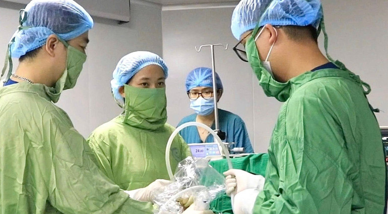 Ê-kíp tiến hành kỹ thuật dẫn lưu màng phổi thai nhi trong buồng tử cung.