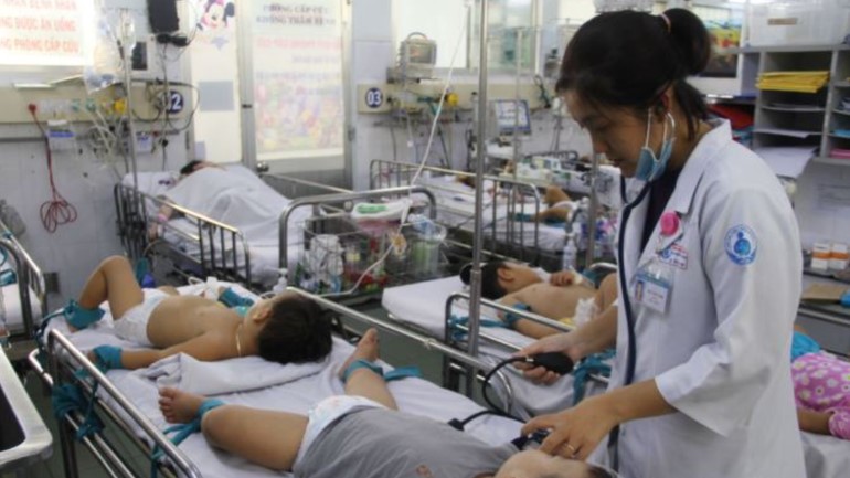 Theo dõi trẻ mắc tay chân miệng tại Bệnh viện Nhi đồng 1, Thành phố Hồ Chí Minh.