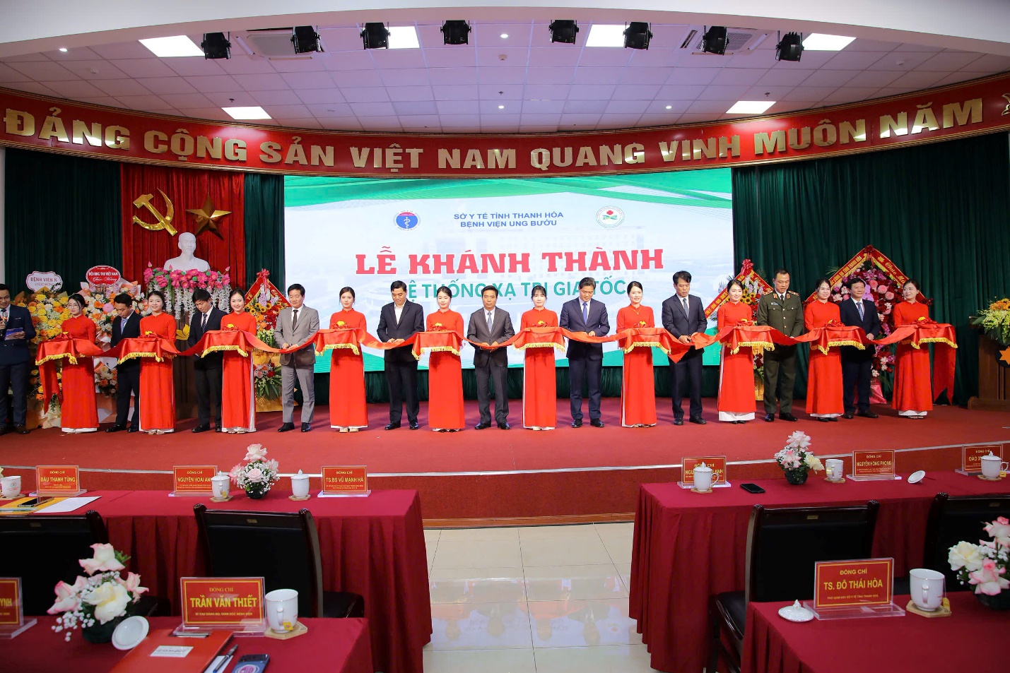 Trong khuôn khổ chương trình, các đại biểu đã thực hiện nghi thức cắt băng khai trương, chính thức đưa hệ thống xạ trị gia tốc tại Bệnh viện Ung bướu tỉnh Thanh Hóa vào hoạt động.