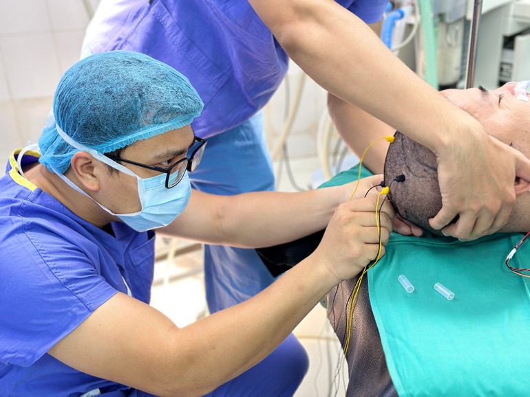 Ê-kíp áp dụng kỹ thuật đặt điện cực theo dõi chức năng liên tục trong lúc bệnh nhân mắc u thần kinh đệm nhu mô não kích thước lớn.