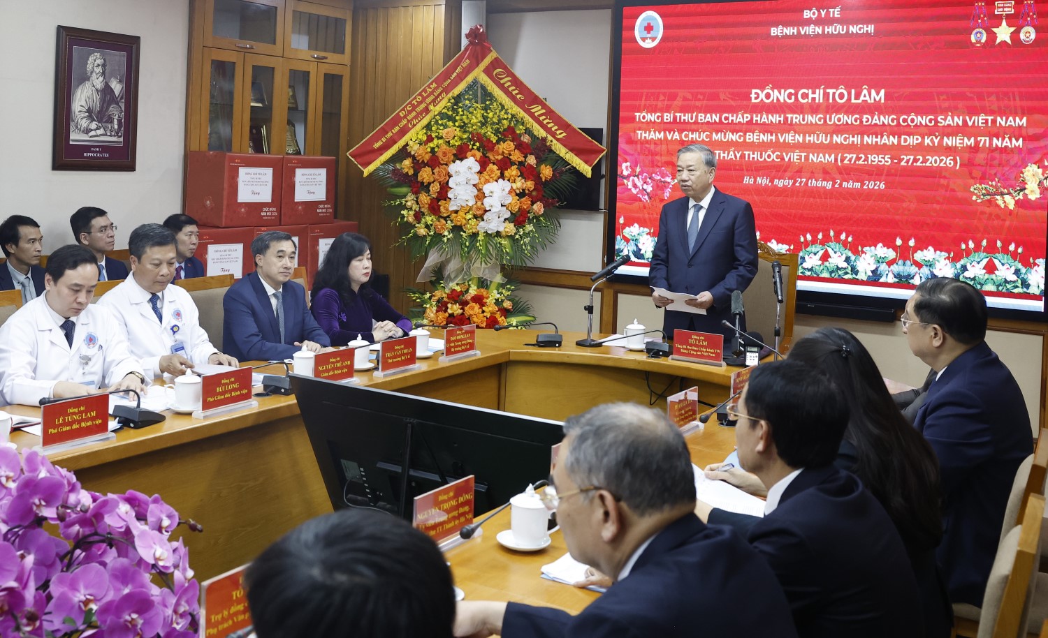 Thứ Sáu, ngày 27/02/2026 11:55Nhân dịp kỷ niệm 71 năm Ngày Thầy thuốc Việt Nam (27/2/1955-27/2/2026), chiều 27/2, tại Hà Nội, Tổng Bí thư Tô Lâm đã đến thăm, chúc mừng cán bộ, nhân viên y tế Bệnh viện Hữu Nghị. ...