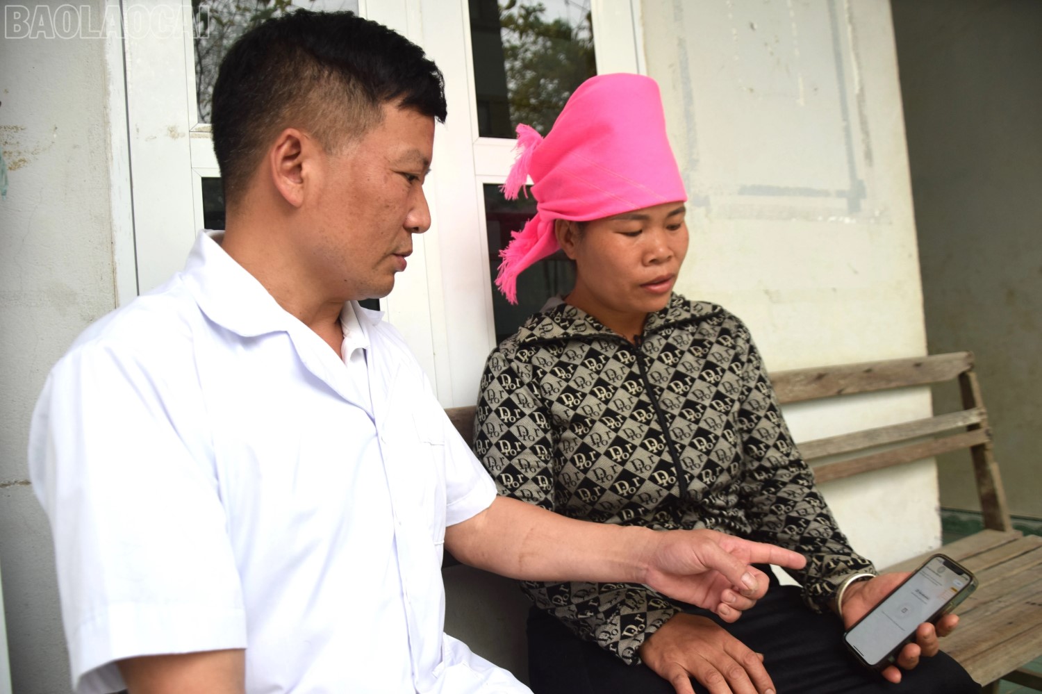 Chị Lường Thị Thiện, thôn Bản Hán, đến khám bệnh tại Trạm Y tế phường Cầu Thia đã được bác sĩ Hoàng Anh Tuấn hướng dẫn tích hợp thẻ bảo hiểm y tế vào Sổ sức khỏe điện tử.