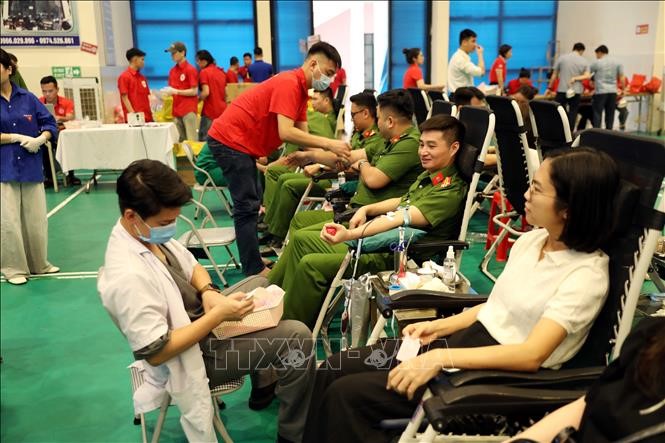 Cán bộ, chiến sĩ tham gia hưởng ứng “Ngày toàn dân hiến máu tình nguyện”. Ảnh: Quang Cường/ TTXVN