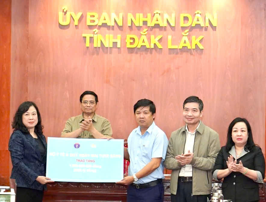Trước sự chứng kiến của Thủ tướng Chính phủ Phạm Minh Chính, Bộ trưởng Bộ Y tế Đào Hồng Lan trao hỗ trợ 1 tỷ đồng cho tỉnh Đắk Lắk