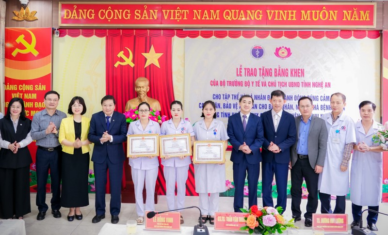 Thứ Ba, ngày 28/10/2025 15:37Sáng 28/10/2025, tại Bệnh viện Sản Nhi Nghệ An, Bộ Y tế và Ủy ban nhân dân tỉnh Nghệ An tổ chức lễ trao tặng Bằng khen của Bộ trưởng Bộ Y tế Đào Hồng Lan và Chủ tịch UBND tỉnh Nghệ An cho 9 tập...
