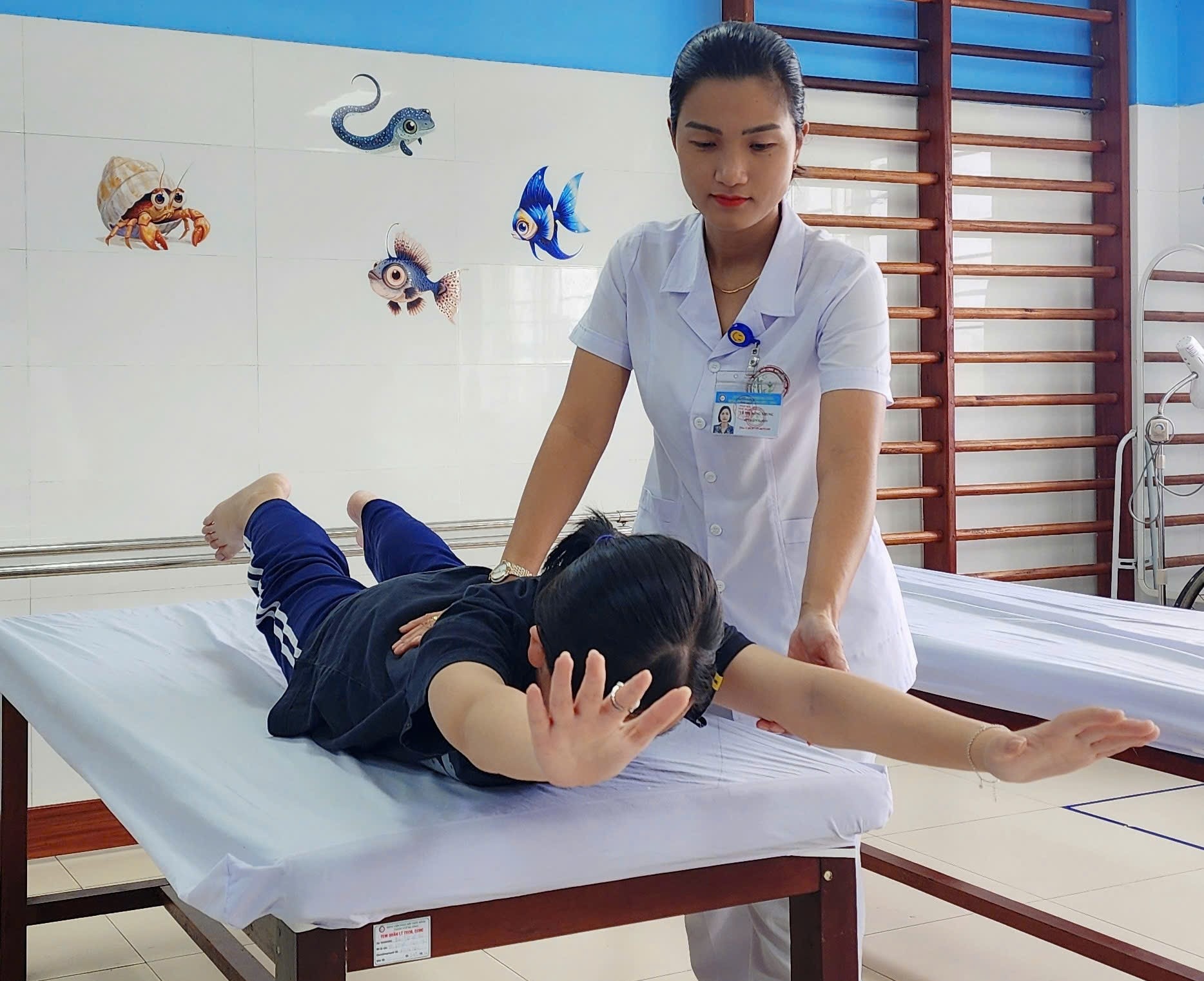 Kỹ thuật y Lê Thị Hồng Nhung chăm sóc, hướng dẫn bệnh nhân thực hiện các bài tập. Ảnh: L.H