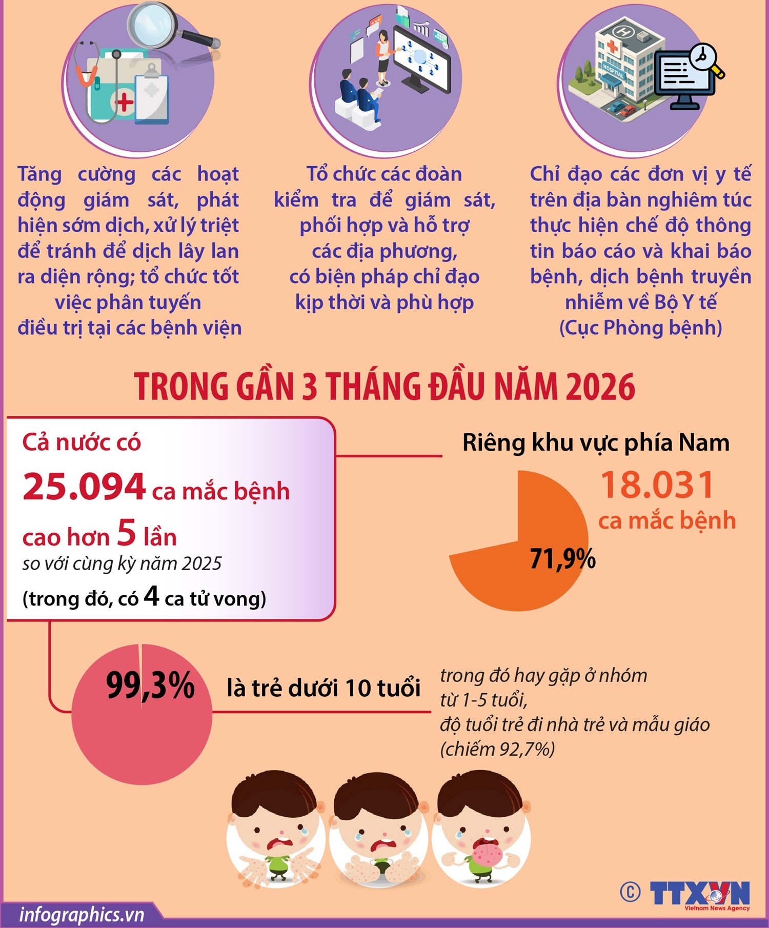 Theo hệ thống giám sát bệnh truyền nhiễm, cả nước ghi nhận gần 25.094 trường hợp mắc bệnh tay chân miệng (4 ca tử vong) trong gần 3 tháng đầu năm 2026, cao hơn 5 lần so với cùng kỳ năm 2025 (4.900 trường hợp bệnh).