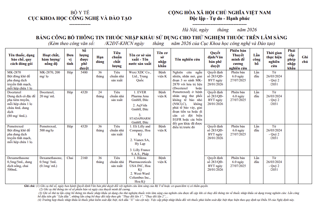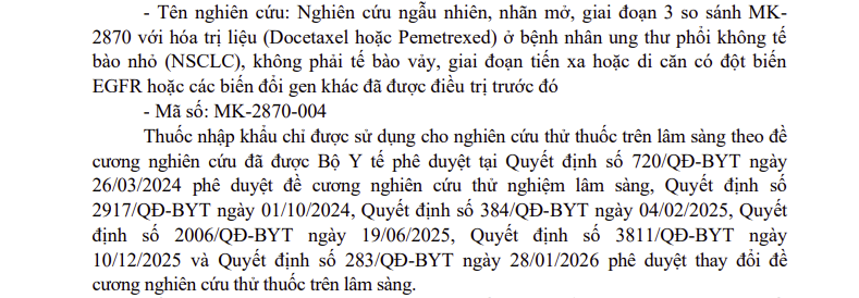 Thông tin các thuốc nhập khẩu sử dụng cho thử nghiệm thuốc trên lâm sàng (MK-2870-004)