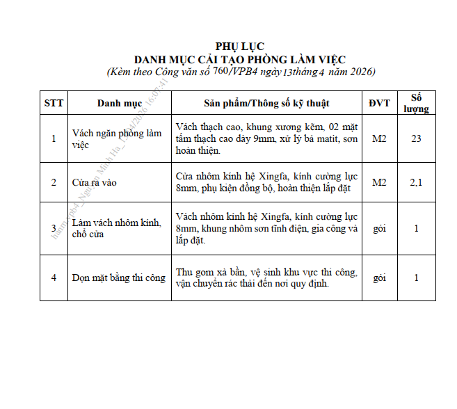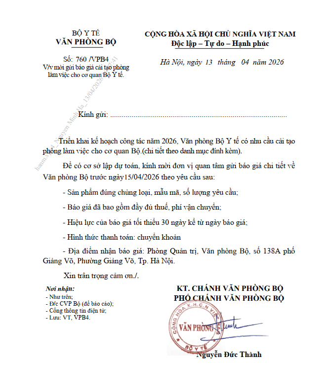 Văn phòng Bộ mời báo giá cải tạo phòng làm việc cho cơ quan Bộ Y tế