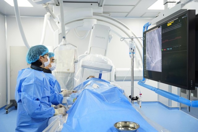 Ths.BS Đinh Danh Trình, Trưởng khoa Tim mạch, Bệnh viện Bãi Cháy cùng ê kíp đang tiến hành chụp và can thiệp đặt stent cho bệnh nhân.
