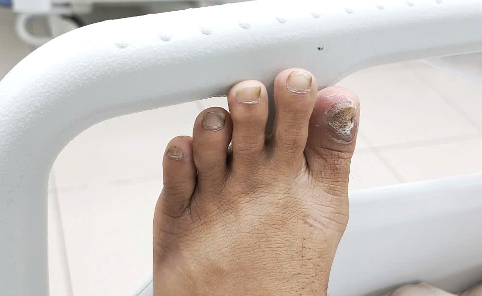 Trường hợp thứ ba là anh N.T.N (37 tuổi, Hà Nội). Gần một tháng trước, trong lúc làm việc tại công trường, anh va chân vào máy cắt khiến bong móng ngón chân cái bên trái.