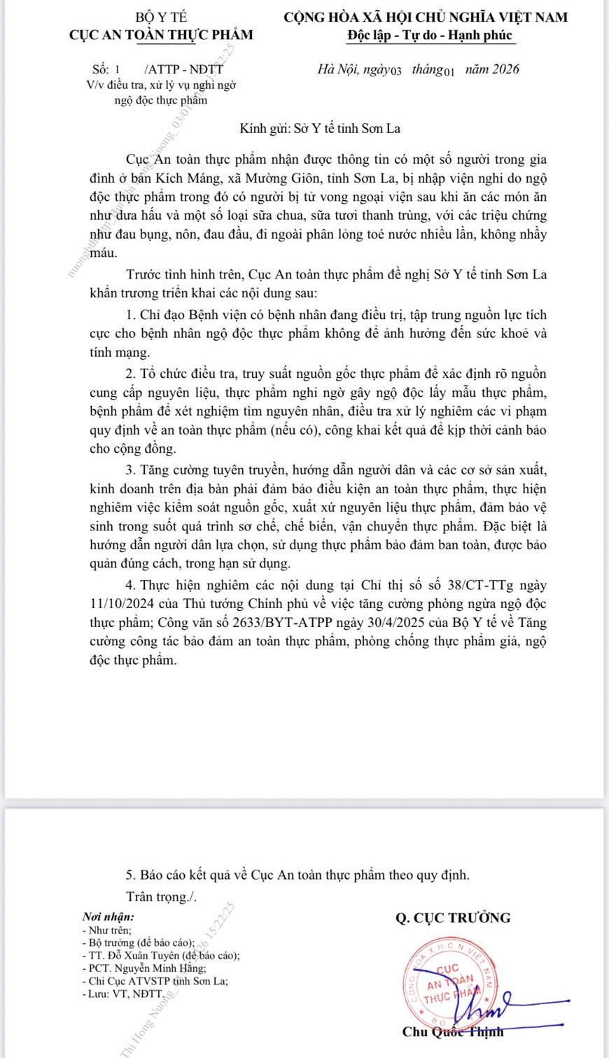 Quyền Cục trưởng Cục An toàn thực phẩm (Bộ Y tế) Chu Quốc Thịnh vừa ký ban hành Công văn số 1/ATTP-NĐTT ngày 03/01/2026 gửi Sở Y tế tỉnh Sơn La về việc điều tra, xử lý vụ nghi ngờ ngộ độc thực phẩm.