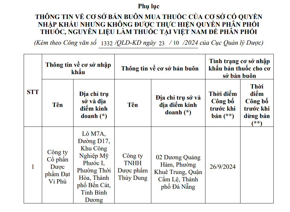 Thông tin về cơ sở bán buôn của cơ sở nhập khẩu nhưng không có quyền phân phối thuốc, nguyên liệu làm thuốc tại Việt Nam để phân phối của Công ty Cổ phần Dược phẩm Đạt Vi Phú