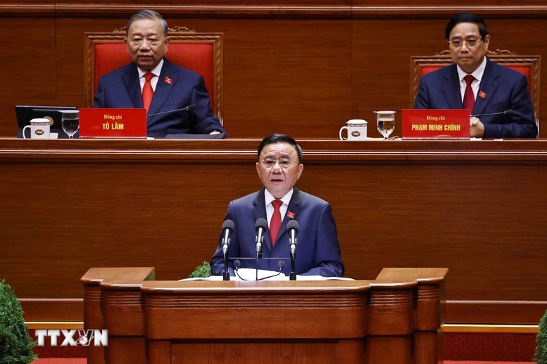 Đồng chí Trần Cẩm Tú, Ủy viên Bộ Chính trị, Thường trực Ban Bí thư trình bày Báo cáo kiểm điểm sự lãnh đạo, chỉ đạo của Ban Chấp hành Trung ương Đảng khóa XIII - Ảnh: TTXVN