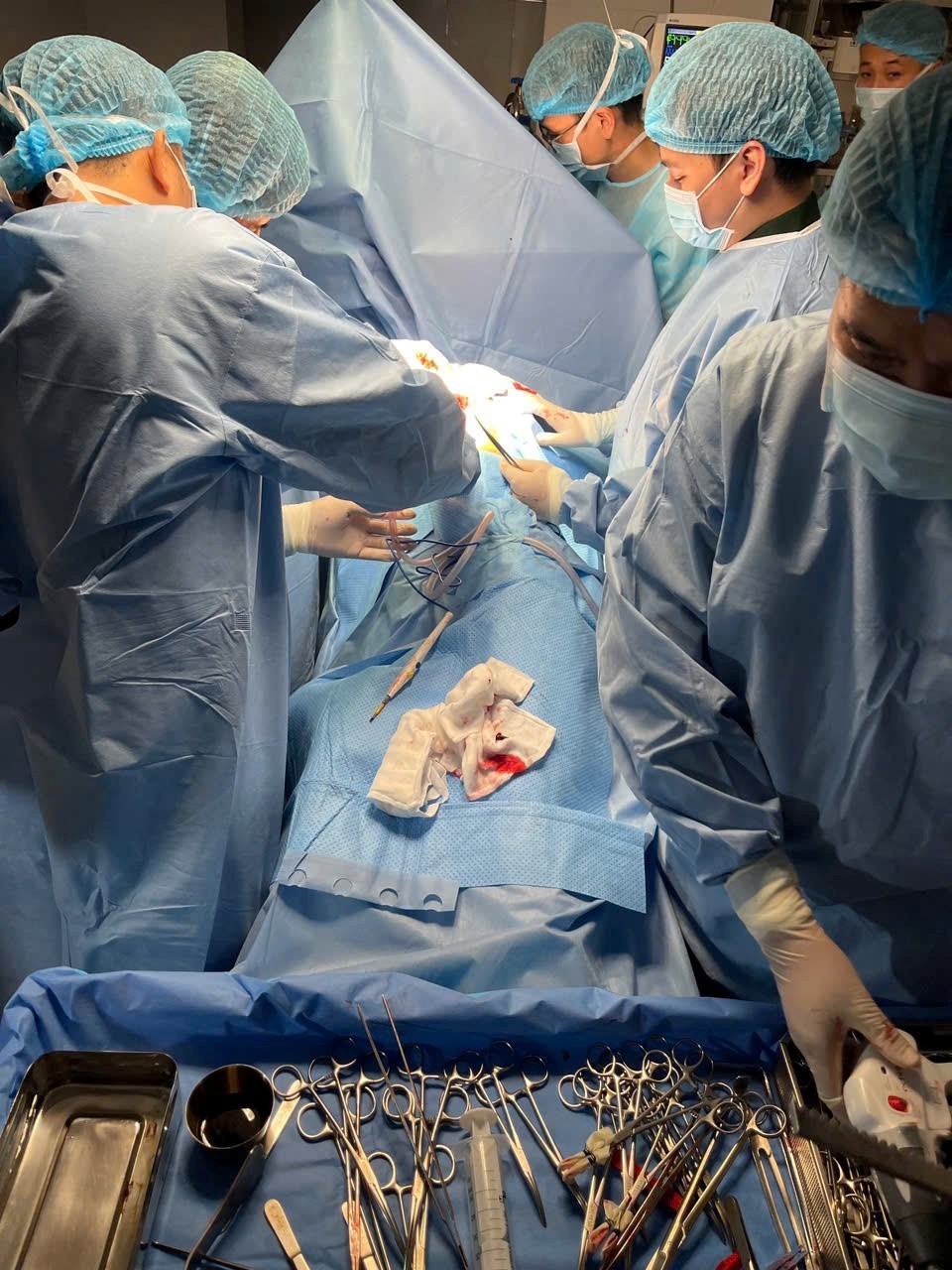 Trong quá trình phẫu thuật, các bác sĩ phát hiện máu chảy từ nhánh động mạch đỉnh phổi bên trái, kèm nhiều kén khí đã vỡ. Khoang màng phổi chứa khoảng 500 ml máu đông, tổng lượng máu bệnh nhân đã mất ước tính 3,6 lít. Ê kíp tiến hành khâu cầm máu, cắt bỏ kén khí và hút sạch máu đông. Mọi thao tác được thực hiện trong điều kiện thiếu thốn trang thiết bị, song vẫn đảm bảo chuẩn kỹ thuật.