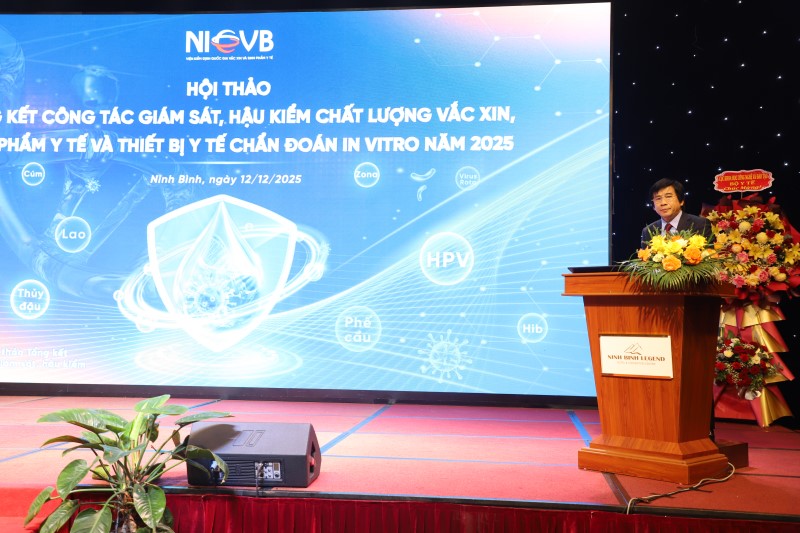 Ngày 12/12/2025, tại tỉnh Ninh Bình, Viện Kiểm định Quốc gia Vắc xin và Sinh phẩm Y tế (NICVB), Bộ Y tế tổ chức Hội thảo Tổng kết công tác giám sát, hậu kiểm vắc xin, sinh phẩm y tế và thiết bị chẩn đoán in vitro năm 2025, với sự tham dự của Lãnh đạo một số Cục, Vụ thuộc Bộ Y tế, các cơ quan quản lý, Viện nghiên cứu, doanh nghiệp, địa phương và tổ chức quốc tế.