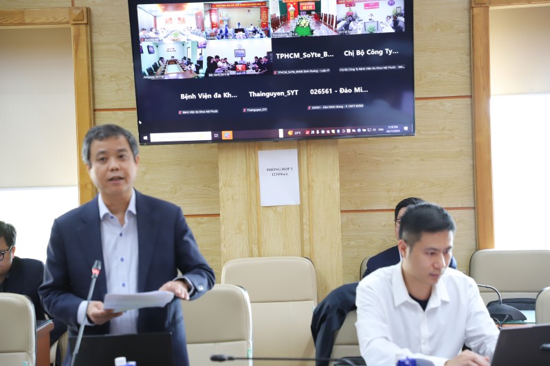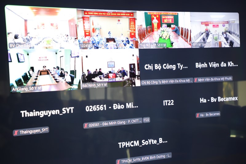 Các đơn vị Bệnh viện Chợ Rẫy, Sở Y tế các tỉnh: Bắc Ninh, Thái Nguyên, An Giang và thành phố Hồ Chí Minh tham gia họp trực tuyến.