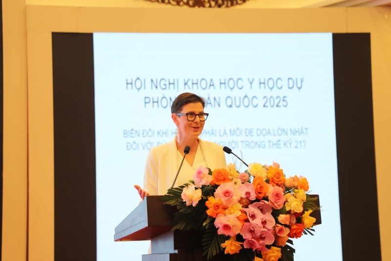 Phát biểu tại hội nghị, TS. Angela Pratt, Trưởng Đại diện Tổ chức Y tế thế giới tại Việt Nam đặt câu hỏi đầu tiên với các đại biểu tham gia chương trình: “Khủng hoảng khí hậu thực chất là khủng hoảng sức khỏe cộng đồng: Ứng phó thế nào?”. Bà Angela Pratt tham luận về ảnh hưởng của biến đổi khí hậu với đối với sức khỏe con người. Theo TS. Angela Pratt khủng hoảng khí hậu thực chất là một cuộc khủng hoảng sức khỏe cộng đồng mà Việt Nam đặc biệt chịu nhiều ảnh hưởng. Khoảng 70% dân số Việt Nam sống ở vùng ven biển hoặc vùng trũng thấp, nơi rất dễ bị tổn thương do thời tiết khắc nghiệt, xâm nhập mặn và mực nước biển dâng. Chúng ta ngày càng chứng kiến nhiều bệnh liên quan đến nắng nóng, bệnh do muỗi truyền và các bệnh về đường hô hấp liên quan đến ô nhiễm hơn. Đây không còn là mối đe dọa trong tương lai mà đã hiện hữu ngay trước mắt và sẽ trở nên tồi tệ hơn trong tương lai nếu không có hành động thay đổi.
