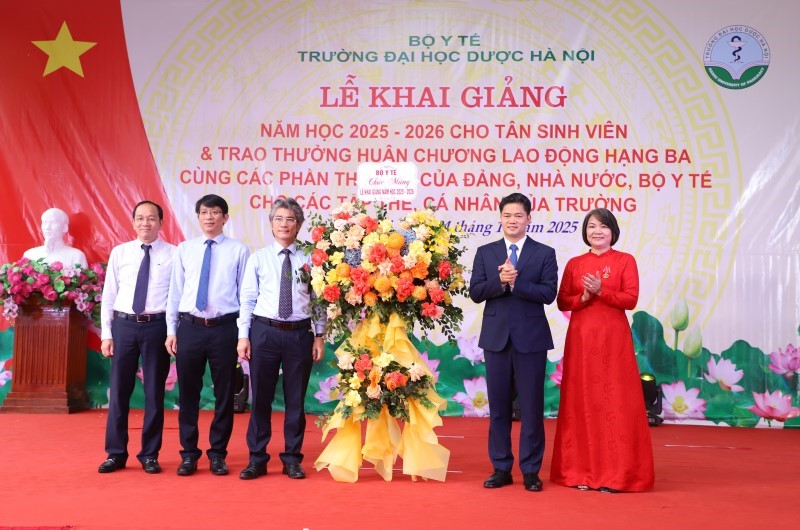 Thay mặt lãnh đạo Bộ Y tế, Thứ trưởng Thường trực Bộ Y tế Vũ Mạnh Hà tặng lẵng hoa chúc mừng lễ khai giảng năm học 2025-2026 của trường Đại học Dược Hà Nội